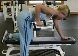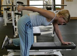 Start: Place same arm and leg on bench, raise opposite elbow high bent at right angle
