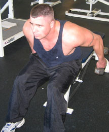 Start: Sitting on bench with torso in upright position and feet at right angle while holding dumbbell behind head in right angle position