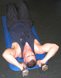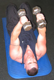 Finish: Lower dumbbells to floor next to ears, rest dumbbells on floor and