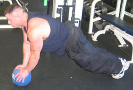 Start: Hands placed on medicine ball with arms extended and feet straight hip width apart
